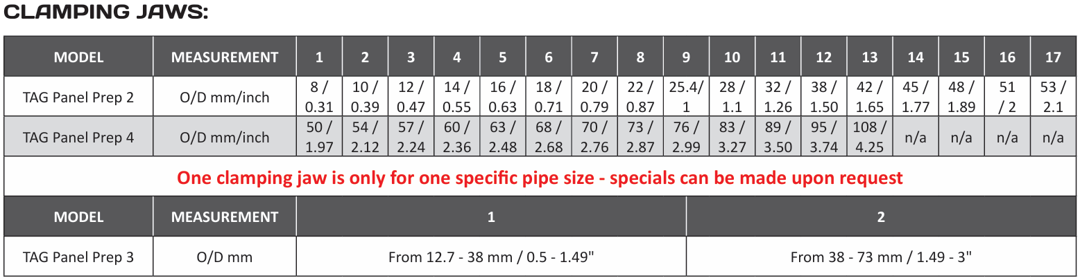 The TAG PANEL PREP attaches to the tube outside diameter by means of custom or specific o/d clamp type jaws that provide strong clamping action that minimizes chatter and vibration.
