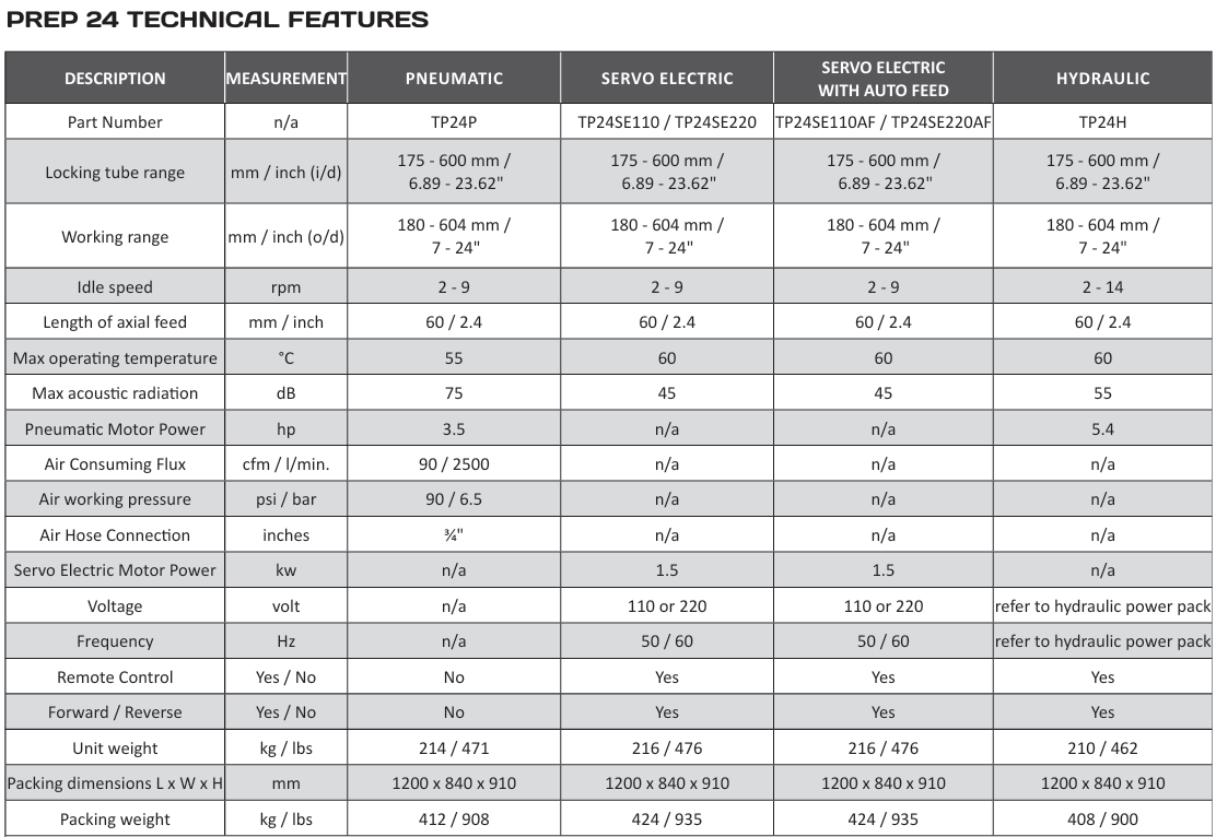 J-preps, counter boring, and facing can all be performed, simultaneously, using the correct tooling fitted in (up to) 4 heavy duty hardened multi-position tool holders. Due to its light weight, yet unrivalled power, the PREP 24 is ideal for on-site, off shore, nuclear, and other applications where precision welds are required at an incredible value.