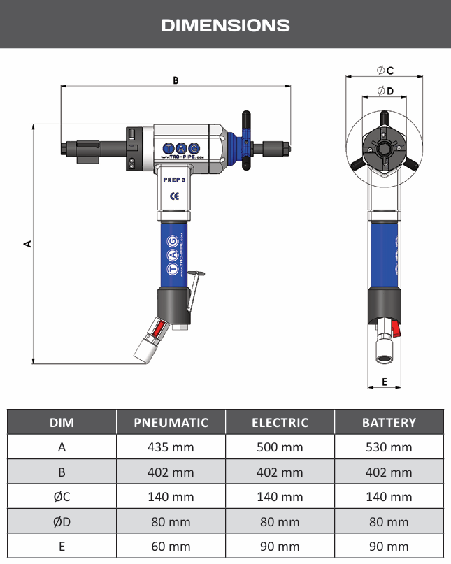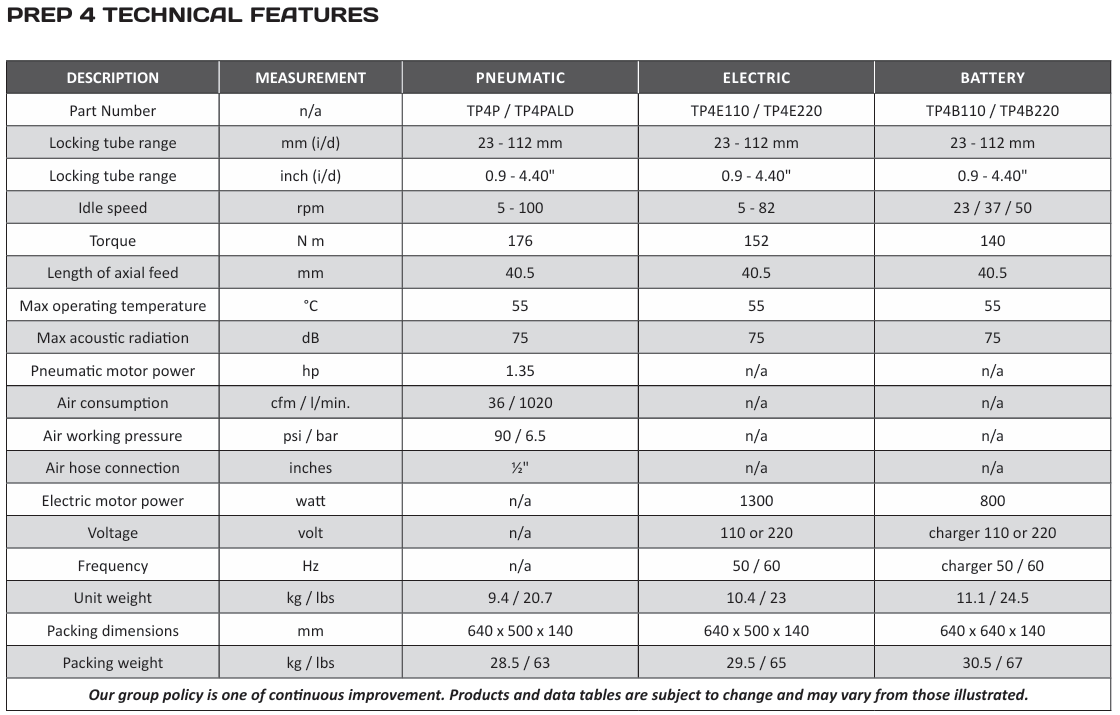 Máy PREP 4 là một trong những model máy thông dụng, được sử dụng nhiều của hãng. PREP 4 có các tùy chọn động cơ điện, pin (110v hoặc 220v) hoặc khí nén, hiện không có đối thủ cạnh tranh nếu so sánh về tỷ lệ kích cỡ máy với công suất. Đài dao cho phép sử dụng đồng thời lên đến 4 dao vát, vát được cho cả ống dày, dễ dàng thao tác đồng thời vát ngoài, vát trong và tiện bằng mặt ống với độ chính xác cao.