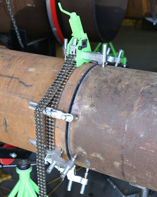 NOTE: MATHEY DEARMAN CHAIN CLAMPS CAN BE RECONFIGURED FOR STAINLESS STEEL AND OTHER SPECIALTY ALLOY APPLICATIONS. REPLACE THE CARBON STEEL ROLLER CHAIN WITH STAINLESS STEEL CHAIN. (ALL OTHER COMPONENTS OF CHAIN CLAMPS ARE MADE OF STAINLESS STEEL)