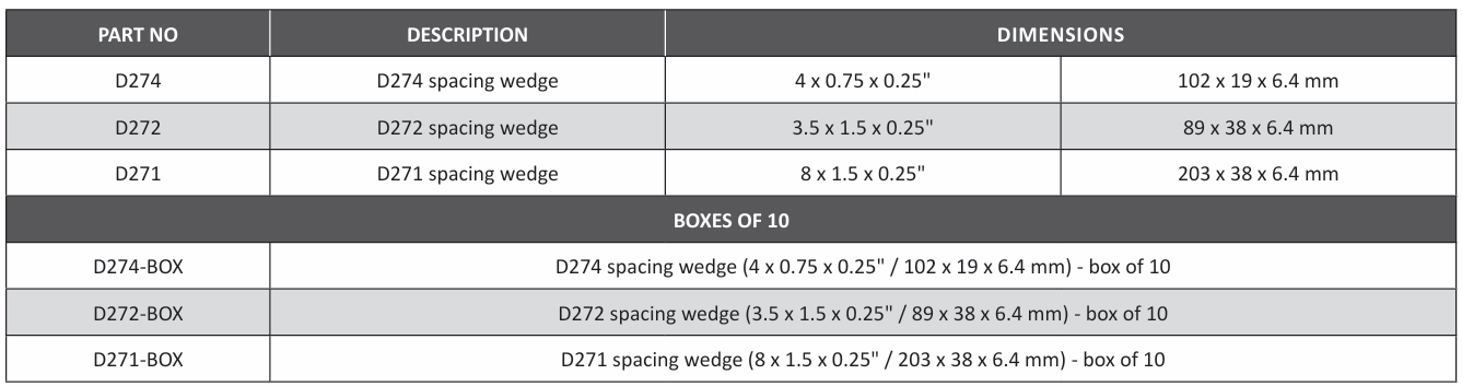 | D271-BOX | 8” x 1 1/2” x 1/4” / 203 x 38 x 6.4mm – Qty 10 | 9.00 | 4.05 | 10 x 8 x 6 | 254 x 203 x 152 |