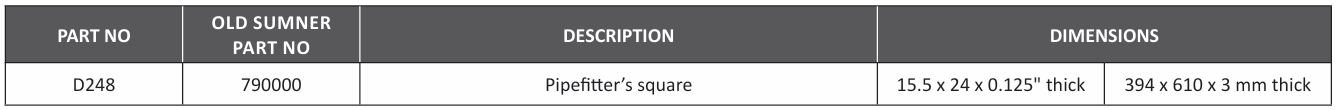 | D248 | Stainless Pipefitters Square | 3.0 | 1.4 | 25 x 18 x 1 | 625 x 450 x 100 |