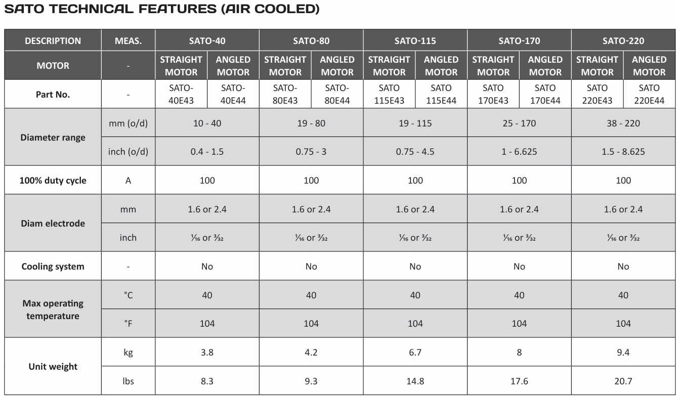 – Motor with encoder: allows for tungsten electrode start-up at all angles and a wide range of diameters