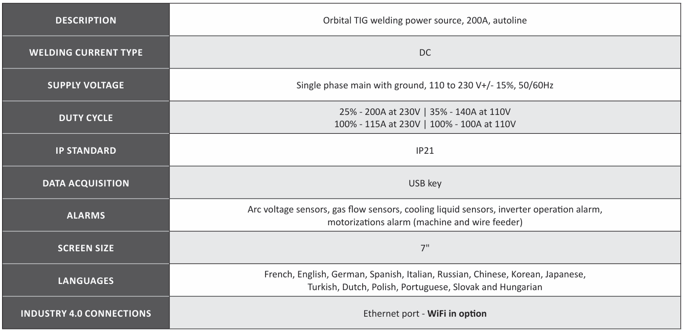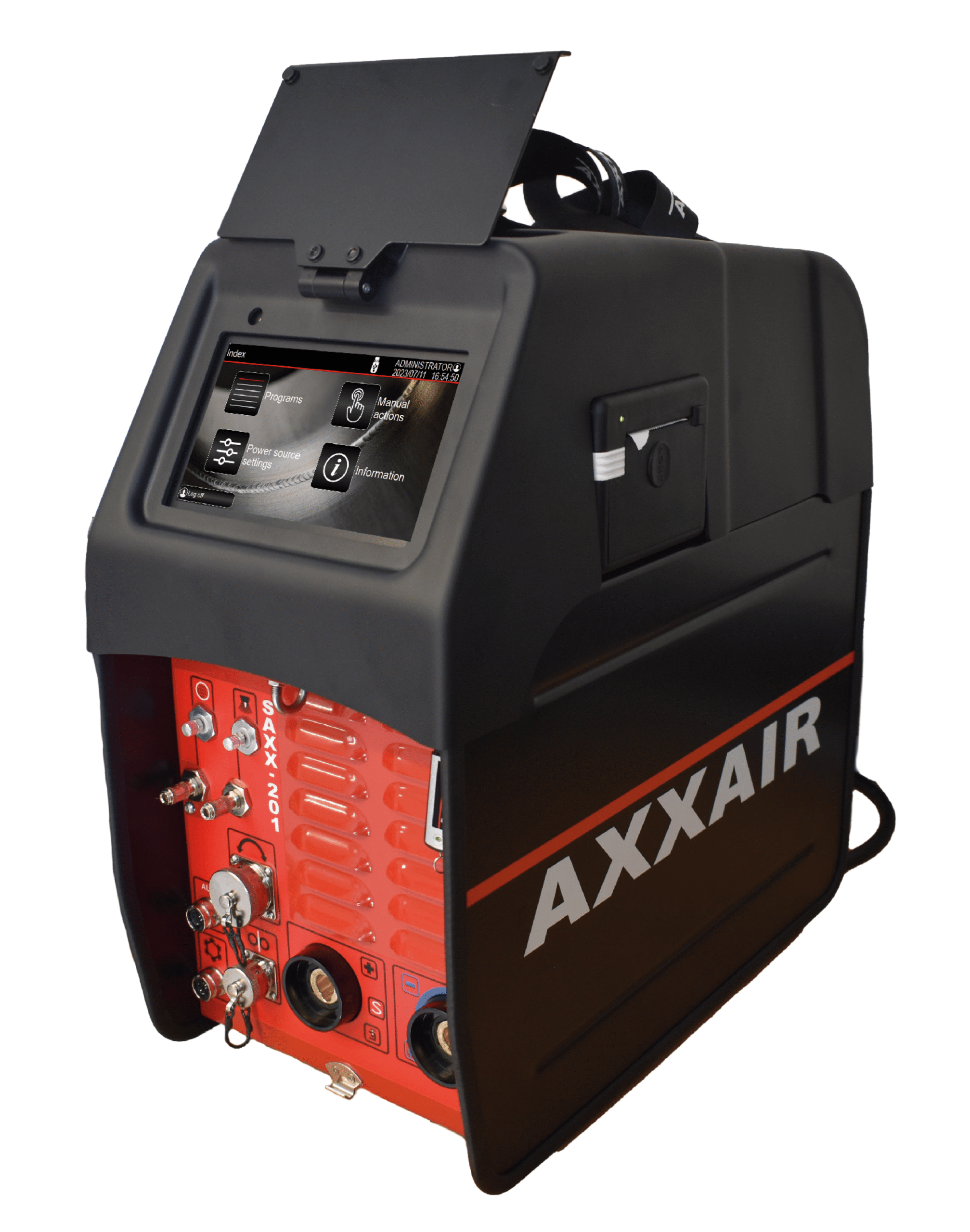 The SAXX-201 is a compact orbital TIG welding power source delivering 200A with intuitive operation. Designed for efficiency, it features a 7″ multilingual touchscreen, automatic parameter caculation, and intergarated printer.Compatible with all AXXAIR welding heads, it enables real-time data acquisition via USB and remote control through Ethernet, Wi-Fi or option pendant. The system supports dual gas lines and wire feed and can intergrade a detachable 700W water-cooling unit for portability. With USB esport and ‘WeldData’ software, users can convert welding logs into WPs format. The SAXX-201 is real for demanding, precise welding tasks across industries, ensuring high performance with user–friendly operation and robust monitoring systerm.